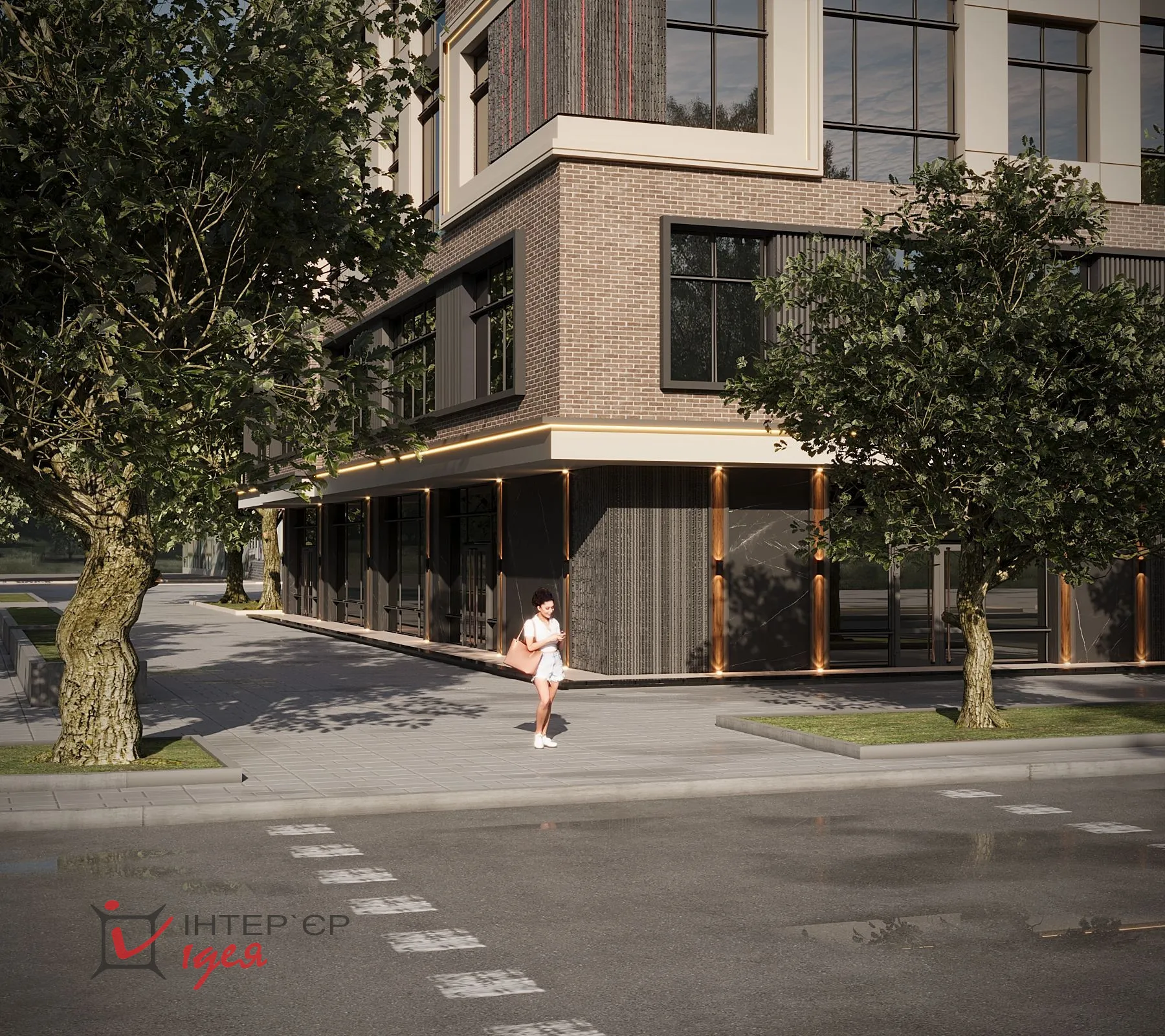 Фрагменти фасадів з високим склінням об'єднані в окремі вертикальні масиви за допомогою обробки чорним кольором та карнизами над парапетом.