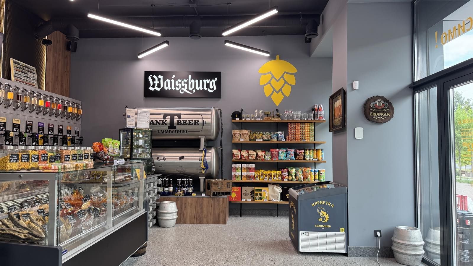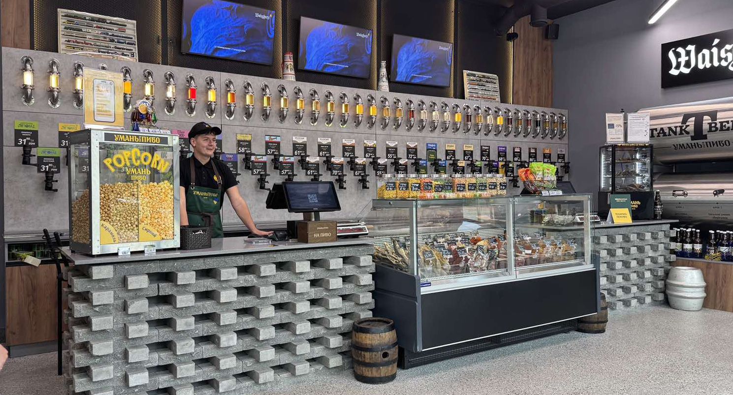 Дизайн інтер'єру чергової торгової точки мережі магазинів "Уманьпиво" виконано у традиційному фірмовому стилі.