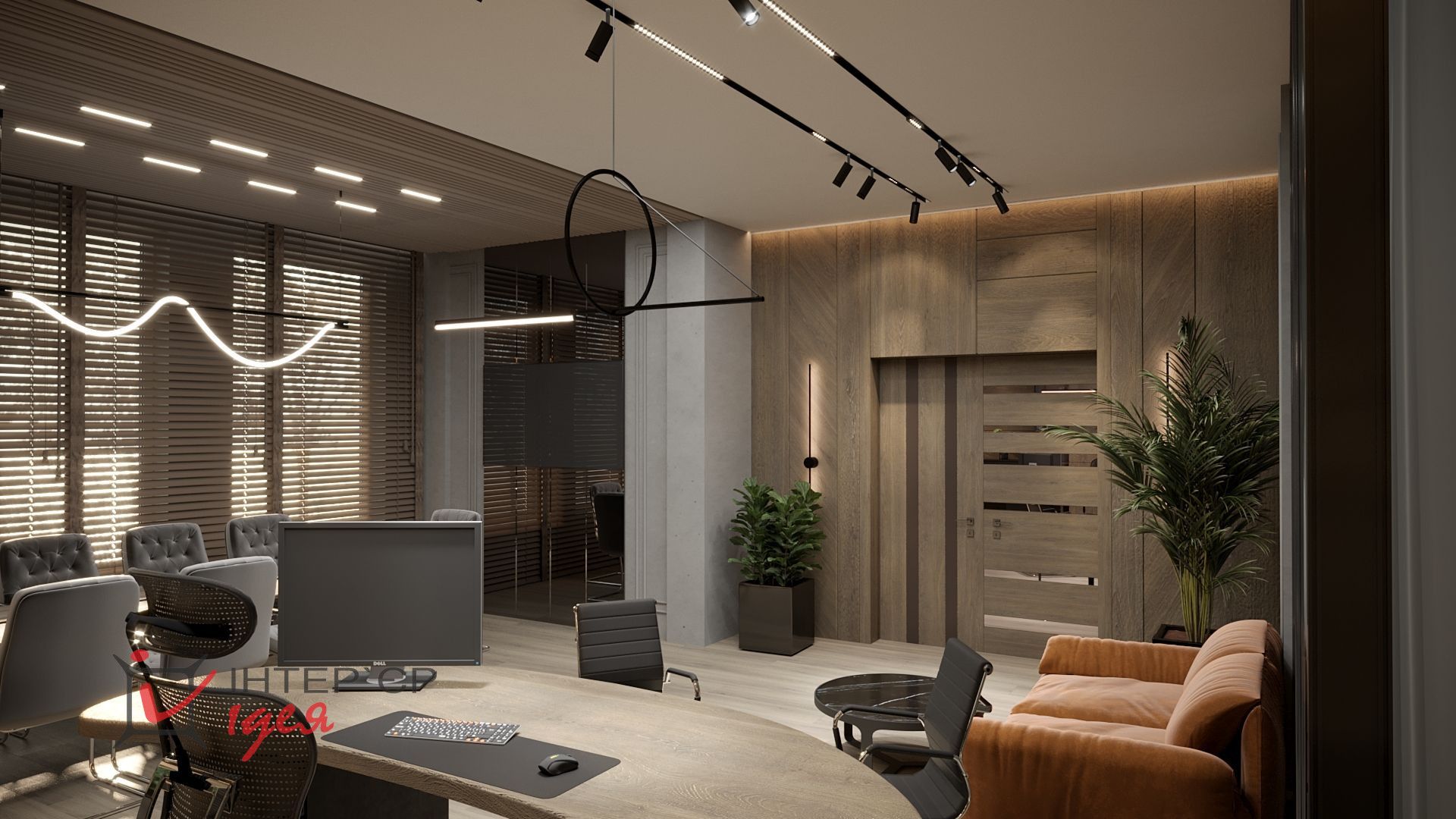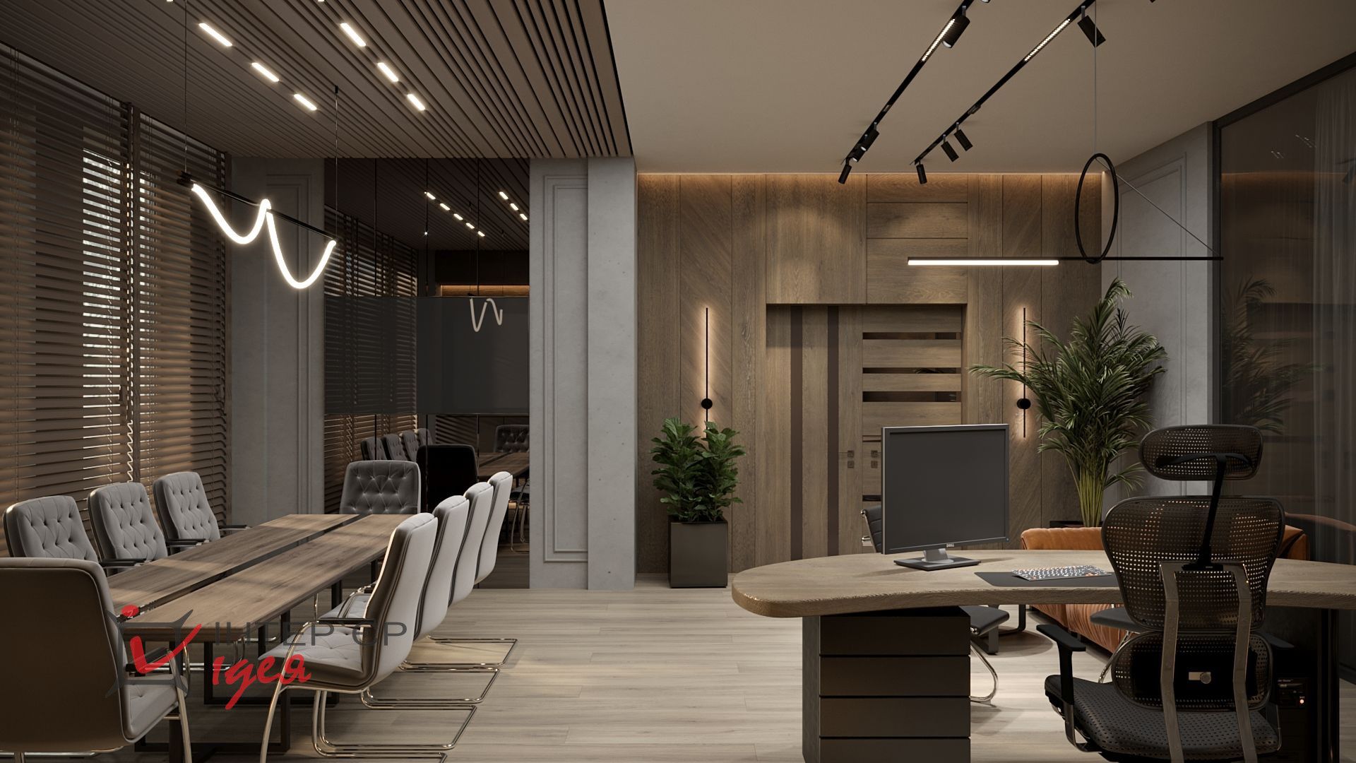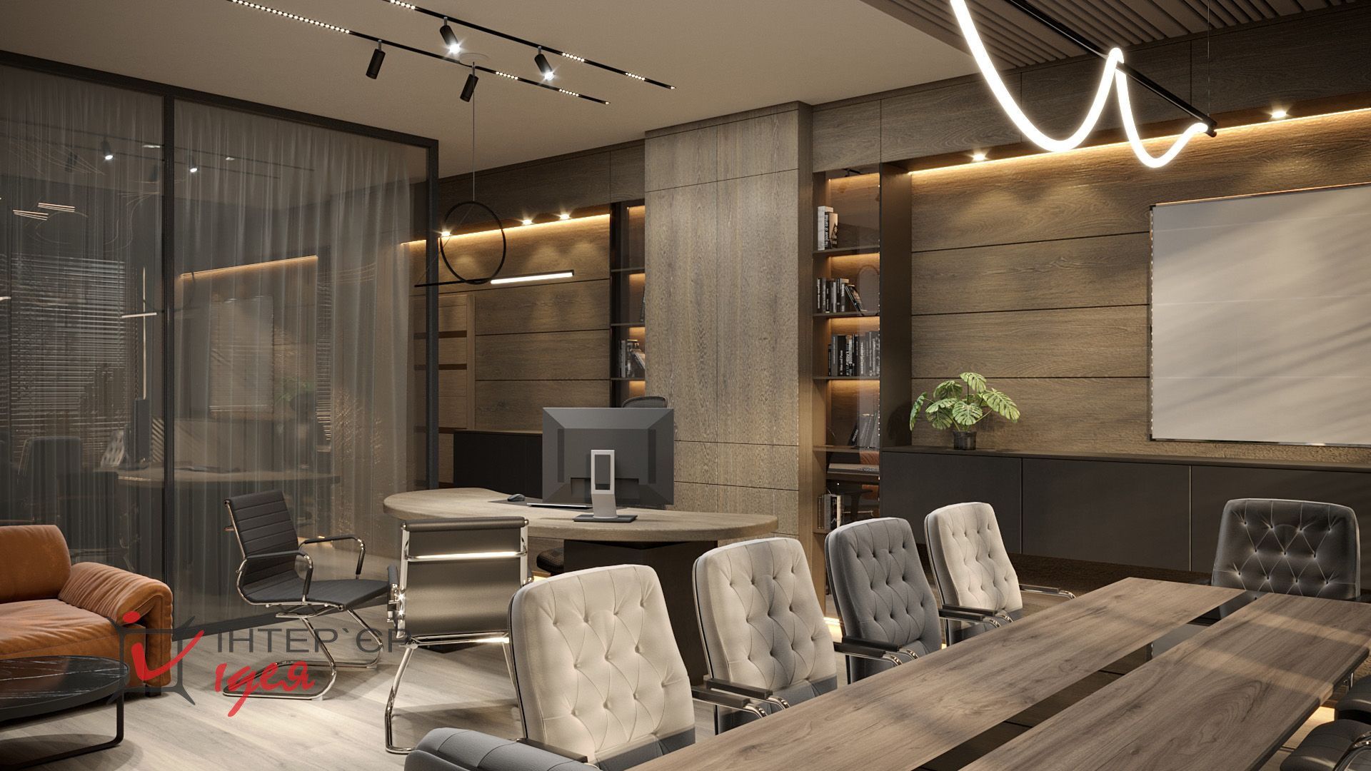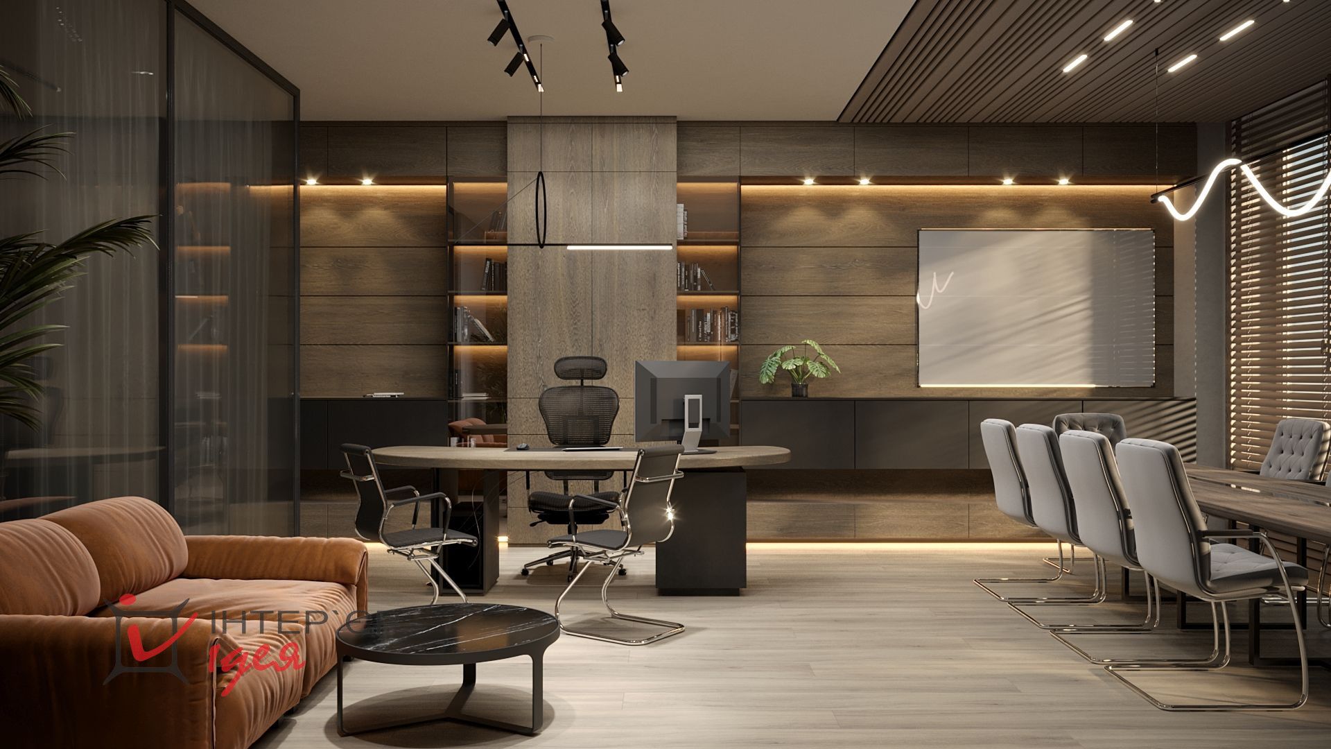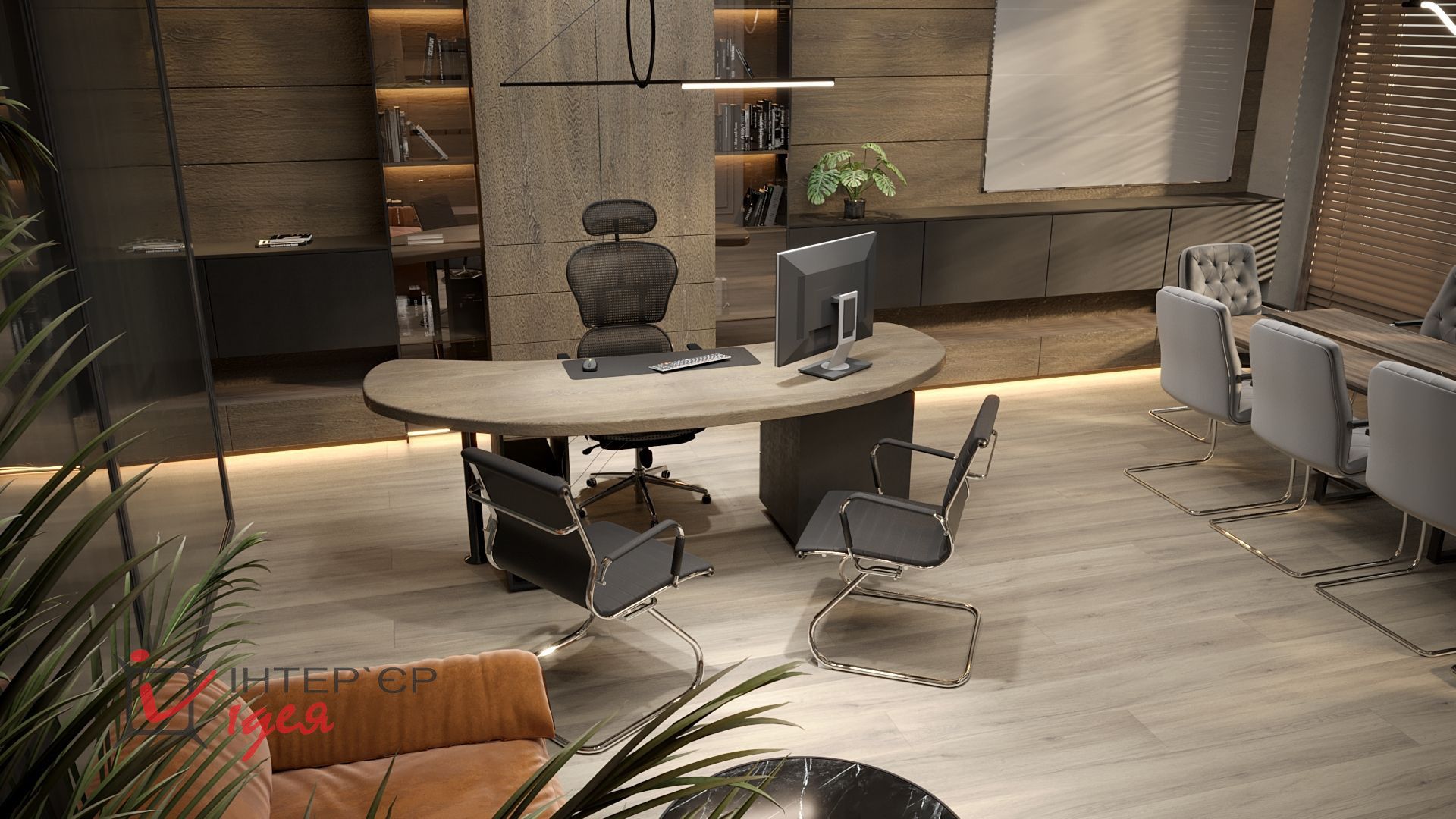 Стіна за спиною керівника оформлена дерев'яними панелями, що доповнюють композицію з вертикальної шафи зі скляними та дереф'яними фасадами, горизонтального комода, розділеного по горизонталі на 2 частини, верхньої чорного кольору та нижньої дерев'яної та довгої закритої полиці під стелею.