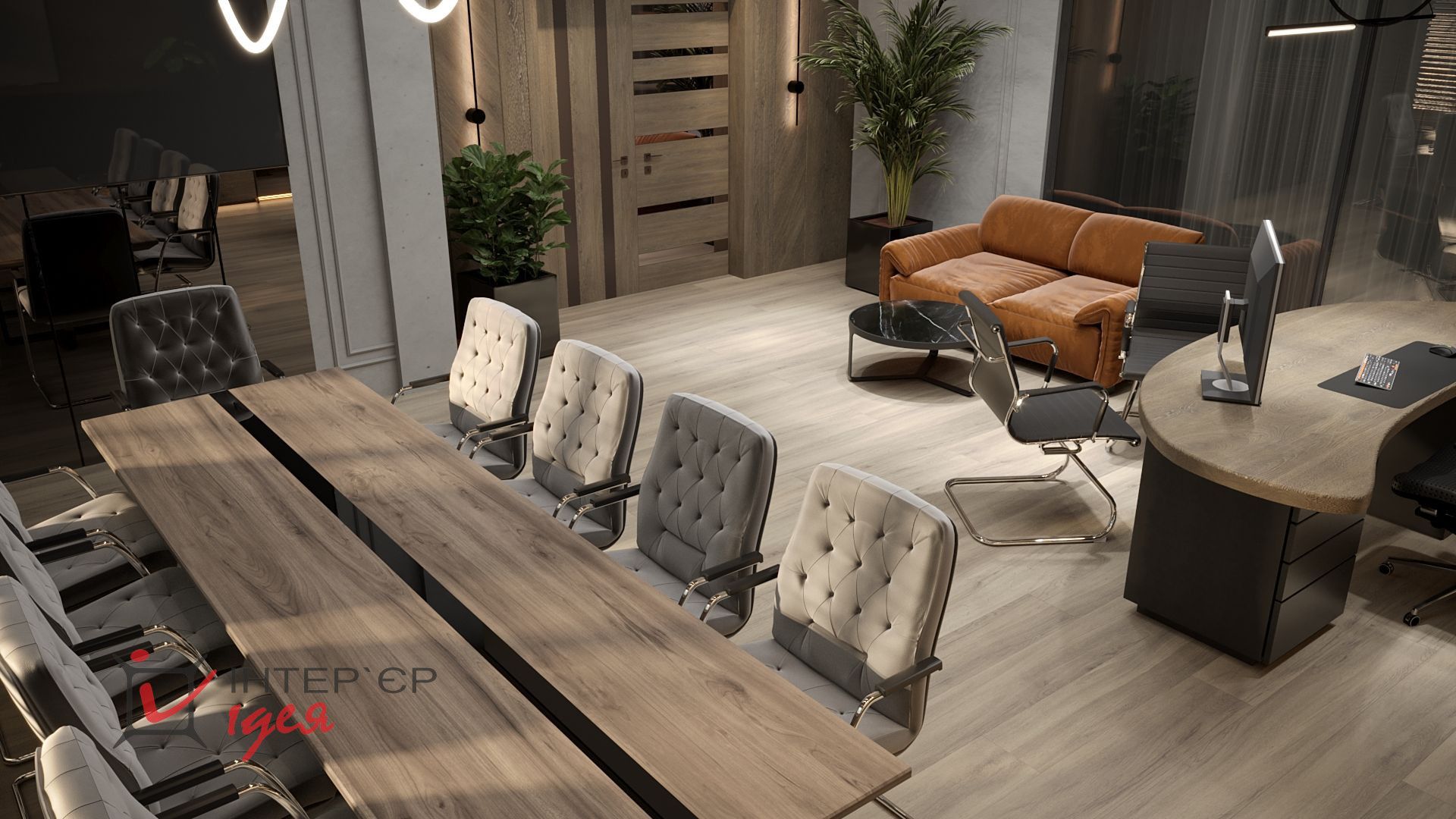 Зона відпочинку відокремлена скляною перегородкою. Зона переговорної виділена стелею, виконаною з металевої кубоподібної рейки Крафт, під якою знаходиться великий переговорний стіл на 10 місць.