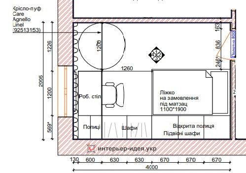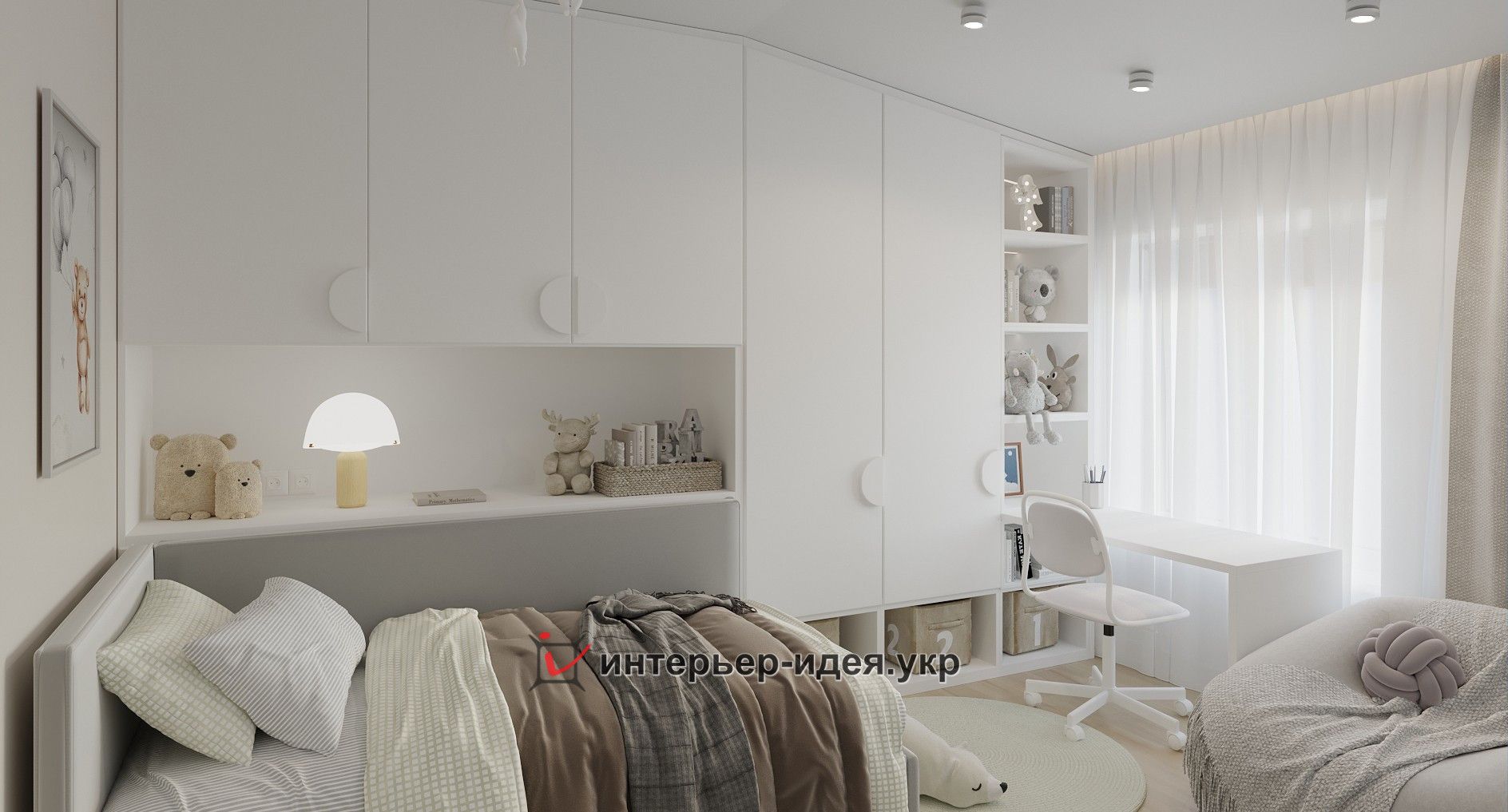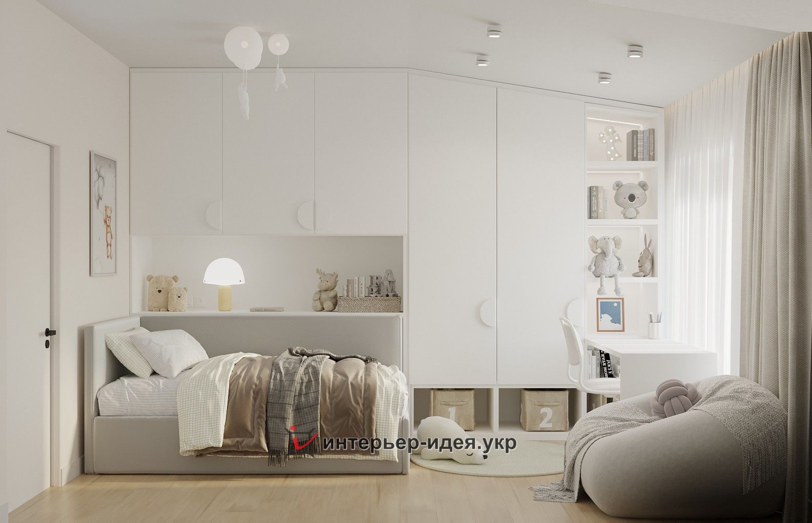 Робочий стіл розташований перед вікном. Під сусідньою стіною – місткі шафи як для одягу, так і для відкриті полиці для іграшок та книжок. Шафи вздовж всієї стіни забезпечать достатньо місця для зберігання одягу