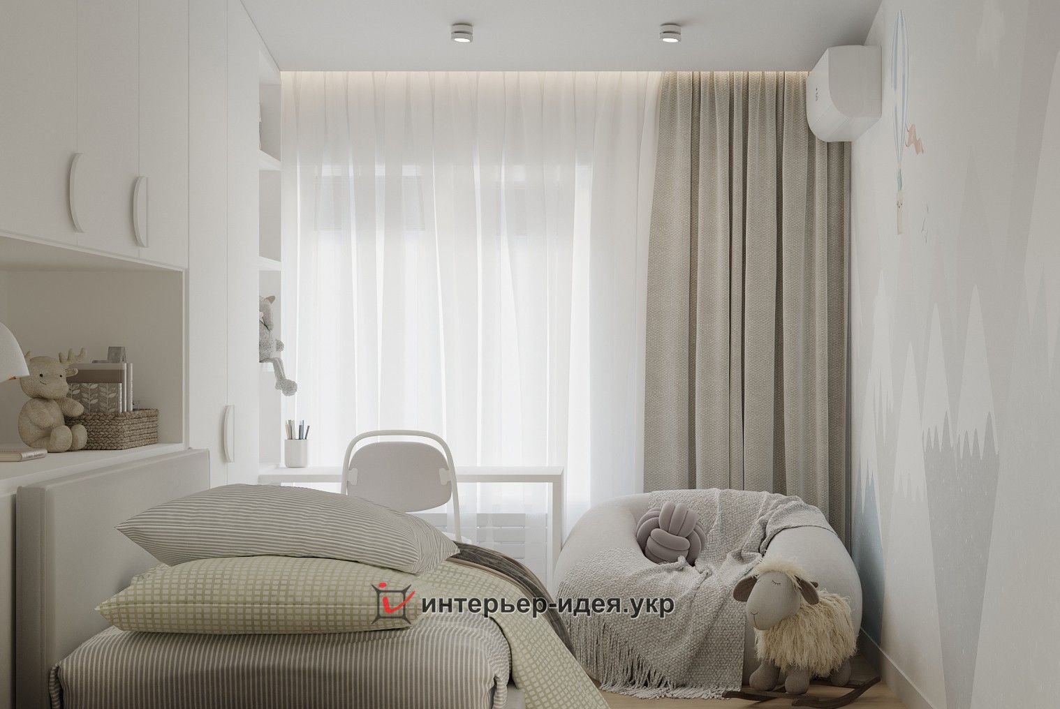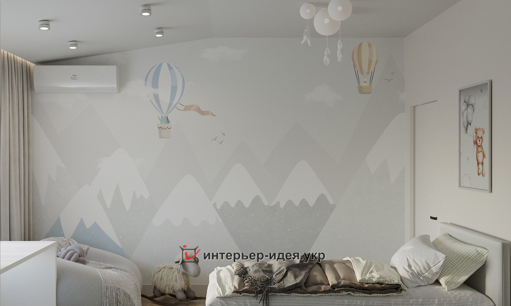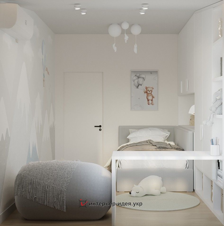 Щоб додати кімнаті ігрового, цікавого настрою, одна із стін оформлена фотошпалерами зі спокійним малюнком, стіна над ліжком прикрашена картиною, а на стелі – підвісні світильники у вигляді кумедних ведмедиків, які літають на повітряних кульках.