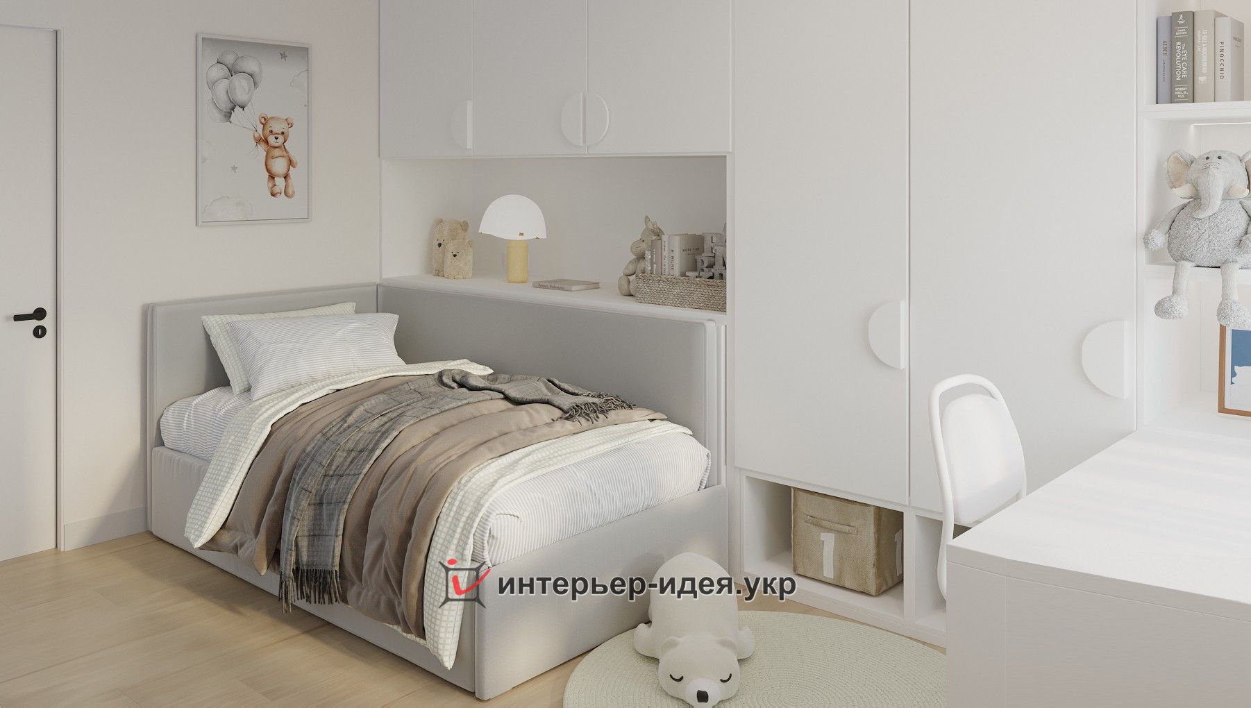Основні кольорова палітра інтер’єру дитячої – білий з додаванням сірого.