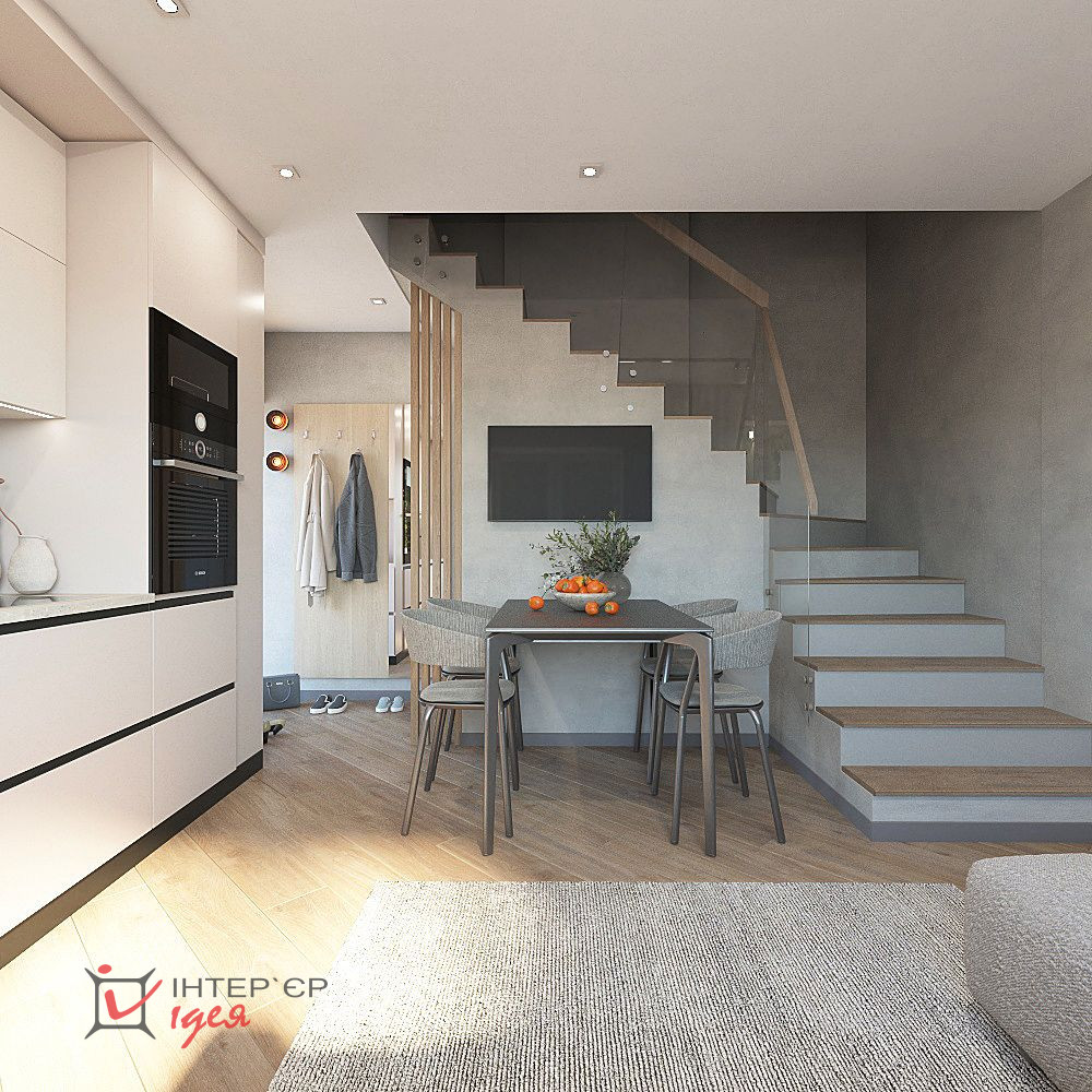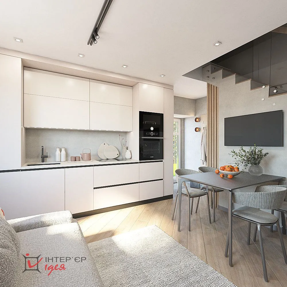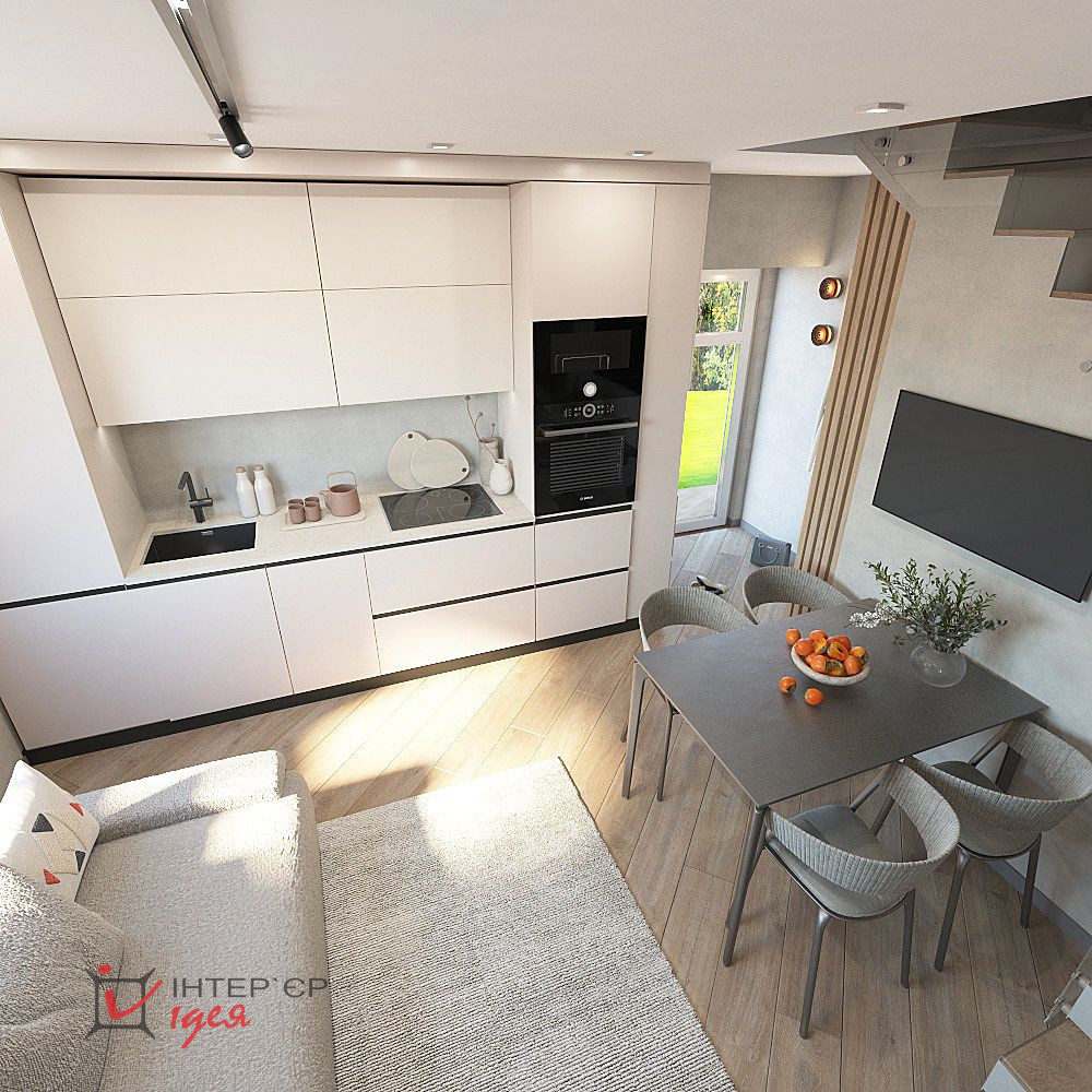 Ця компактна кухня-студія площею 20 кв.м на першому поверсі приватного будинку створена для молодої пари/