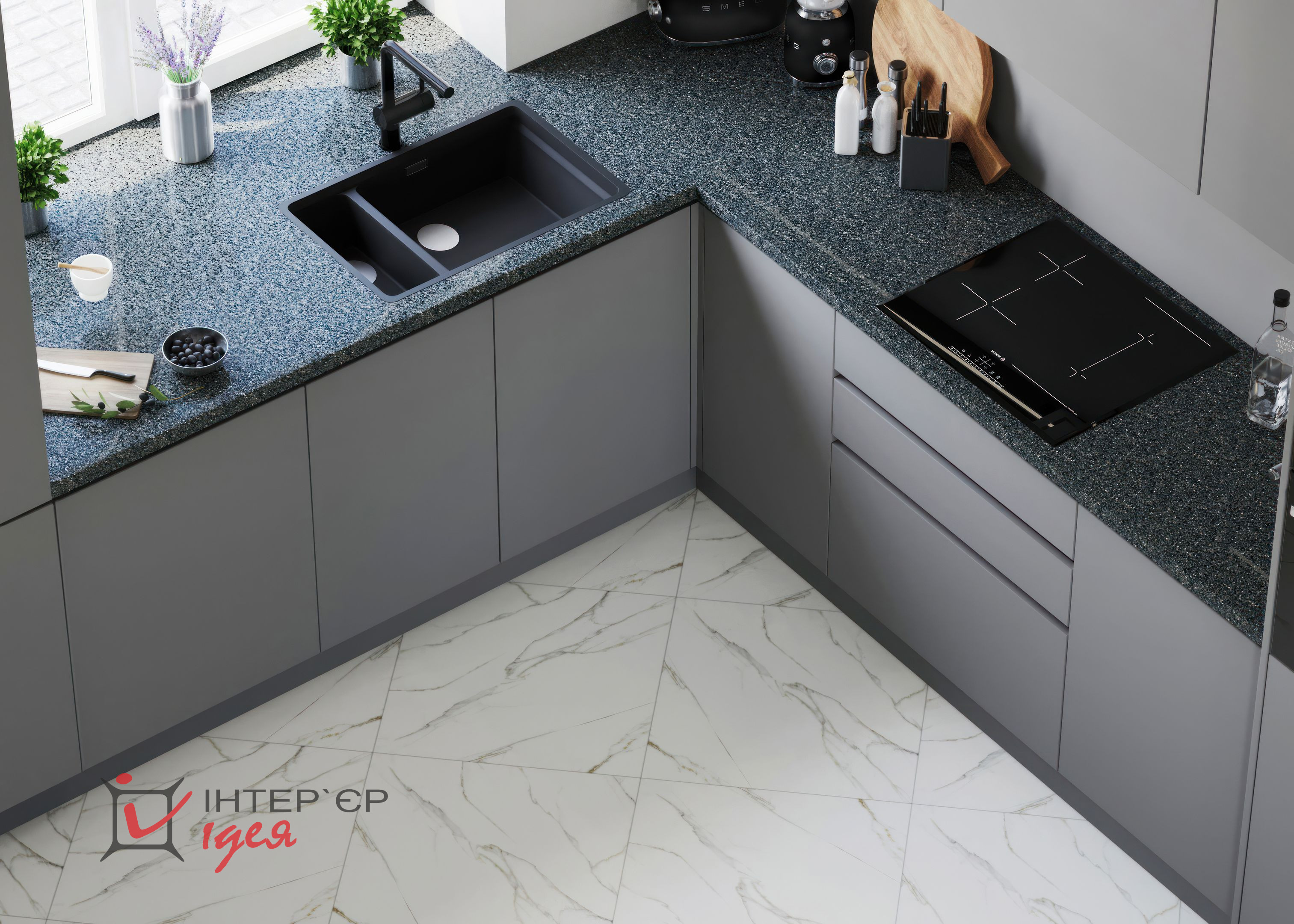 Кухонна зона представлена сучасними меблями з гладкими фасадами у сірому кольорі, що надає кімнаті легкості. Вбудовані шафи з чорними ручками додають контрасту та підкреслюють сучасний стиль. Стільниця з темного граніту виглядає розкішно і водночас практично.