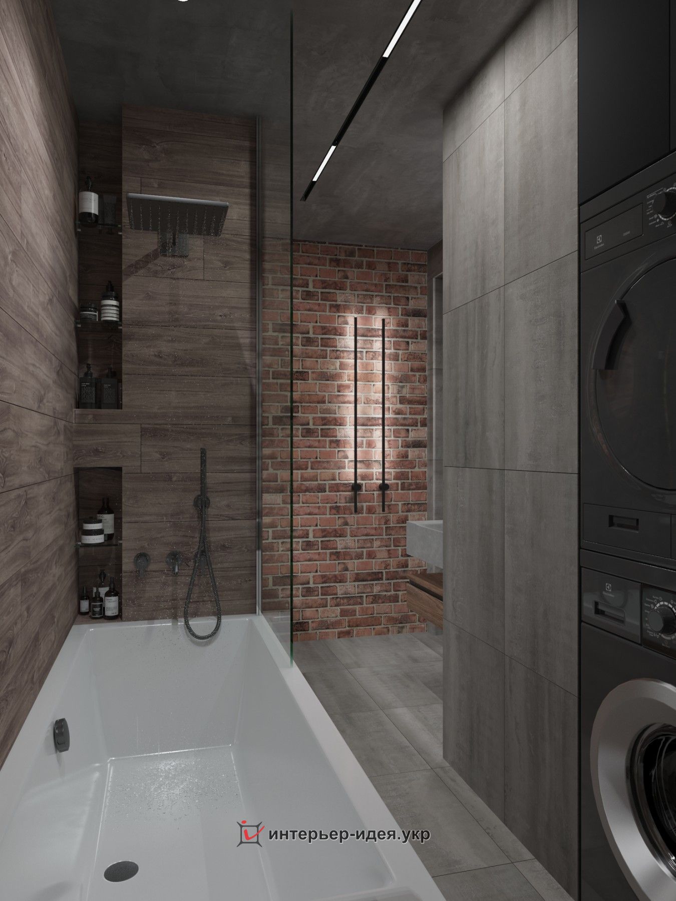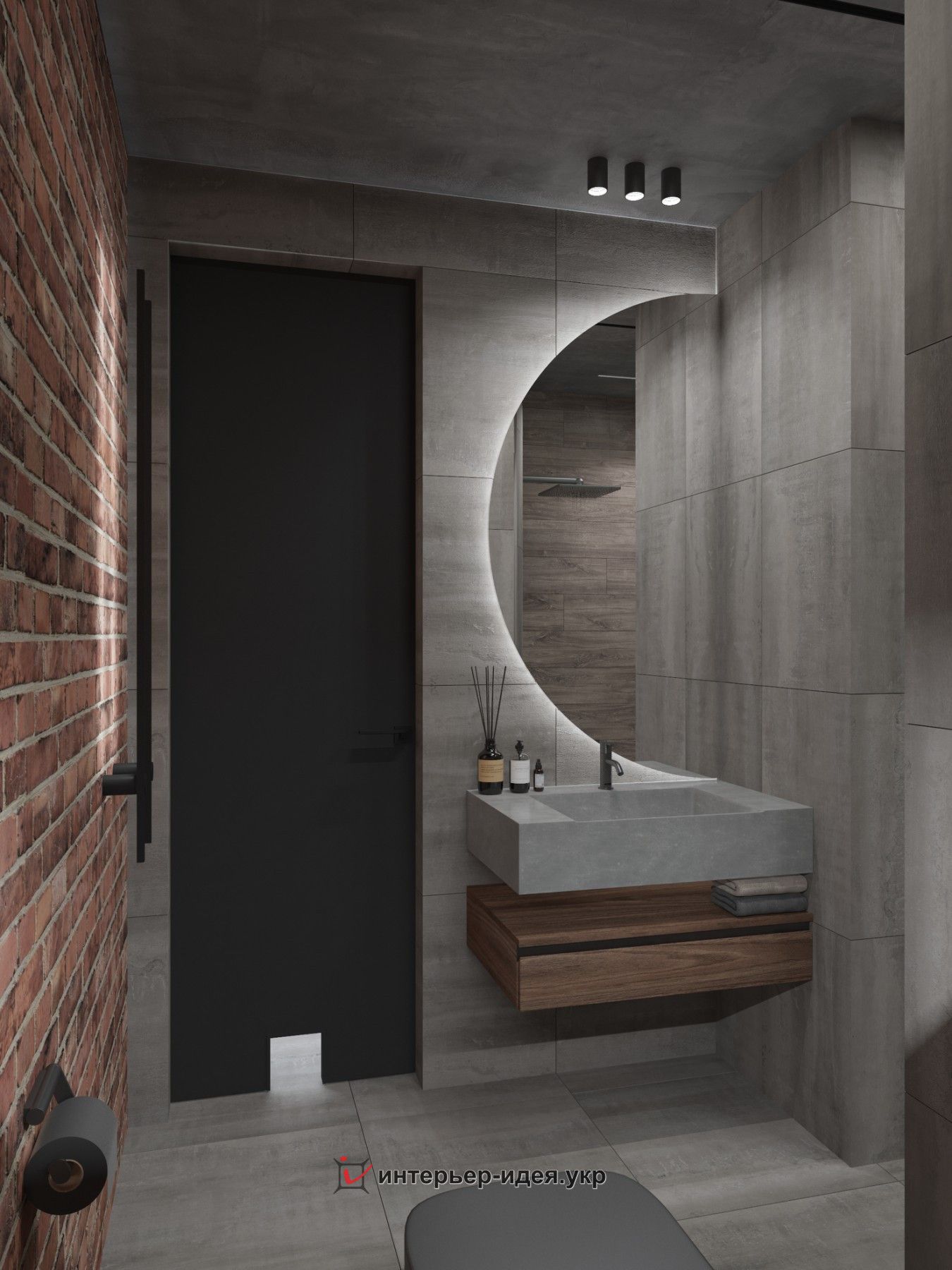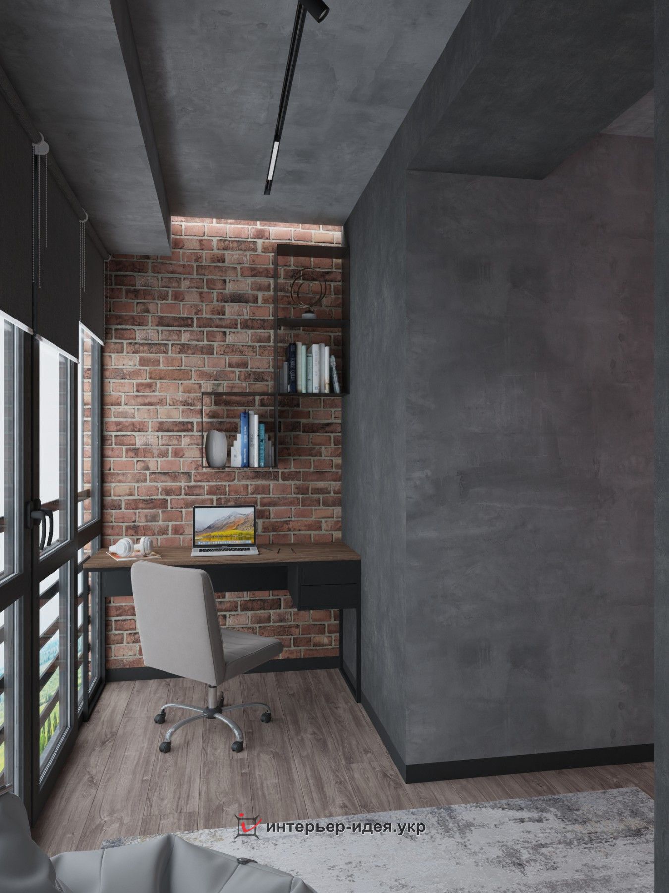 Ефект лофту підсилює нанесення штукатурки під бетон, цегляна кладка на стінах.