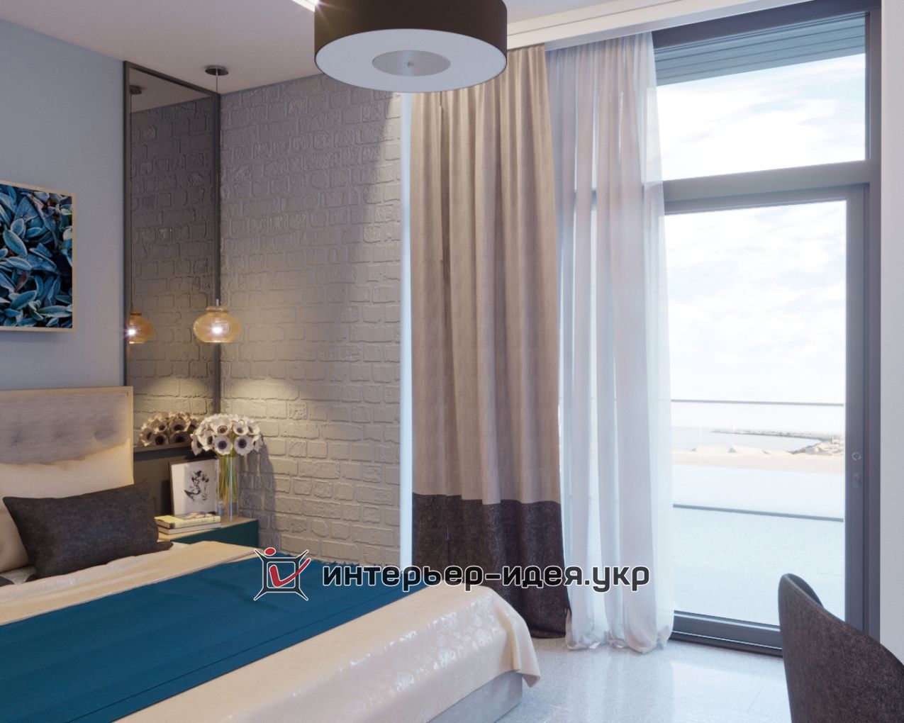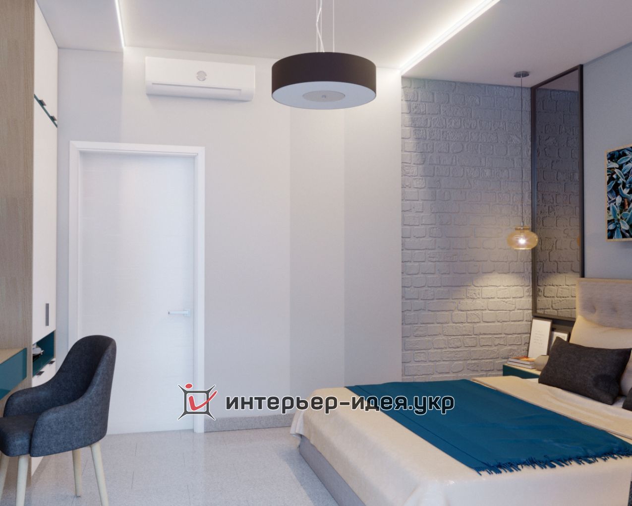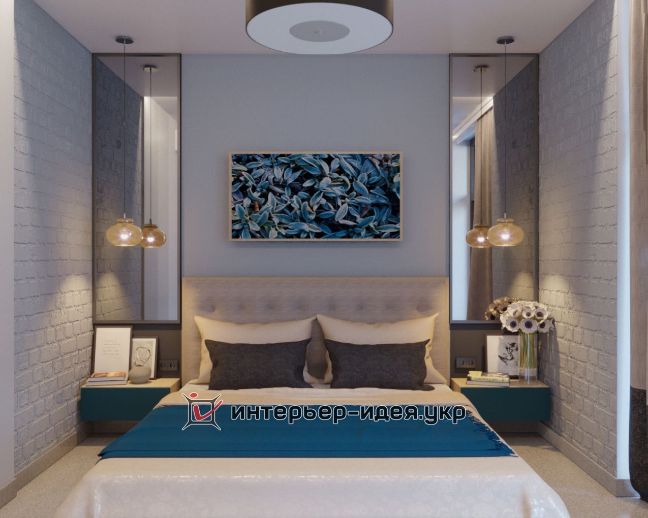 Кімната невелика, і до того що служить гостьовою, заплановане невелике робоче місце. Виділена зона по обидва боки ліжка у вигляді дзеркал в металевій рамі, що робить кімнату більше.