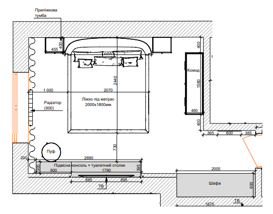 Кожен елемент меблів в цій кімнаті пропрацьований і буде виготовлений на замовлення, для того щоб їх власниця відчувала себе ще більш особливою.