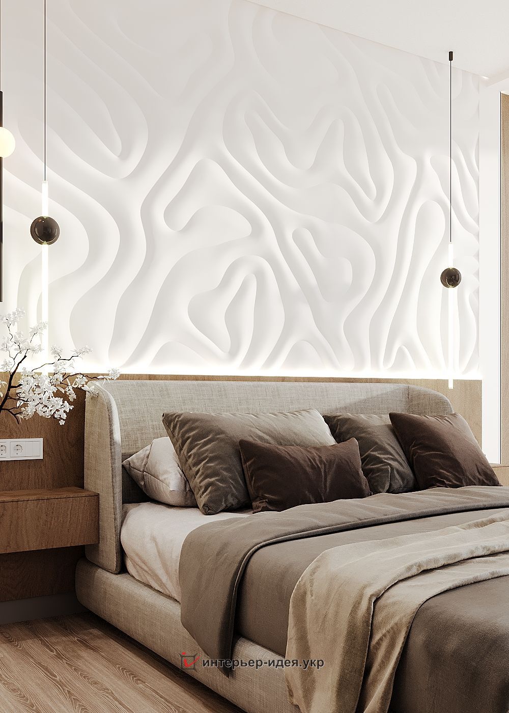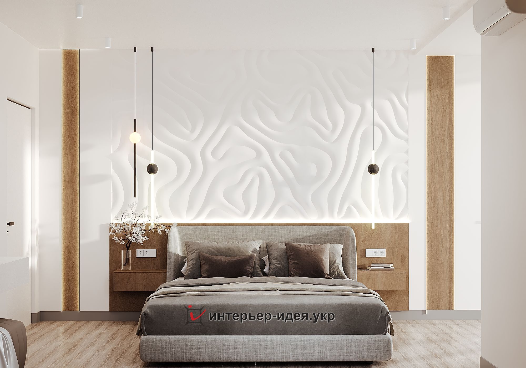 Створено затишний сучасний простір зі стриманими чіткими лініями, легкою кольоровою гамою у вигляді відтінків сірого, які доповнює теплий відтінок деревини, а додає шарму – акцентна стіна над ліжком. Акцентна стіна, яка нагадує дюни безкрайніх морських пляжів, так навіює спогади і надихає кожного ранку... Підсвітка за ліжком чудово доповнює розсіяне світло від світильників, та створюватиме теплу домашню атмосферу навіть найхолоднішими вечорами.