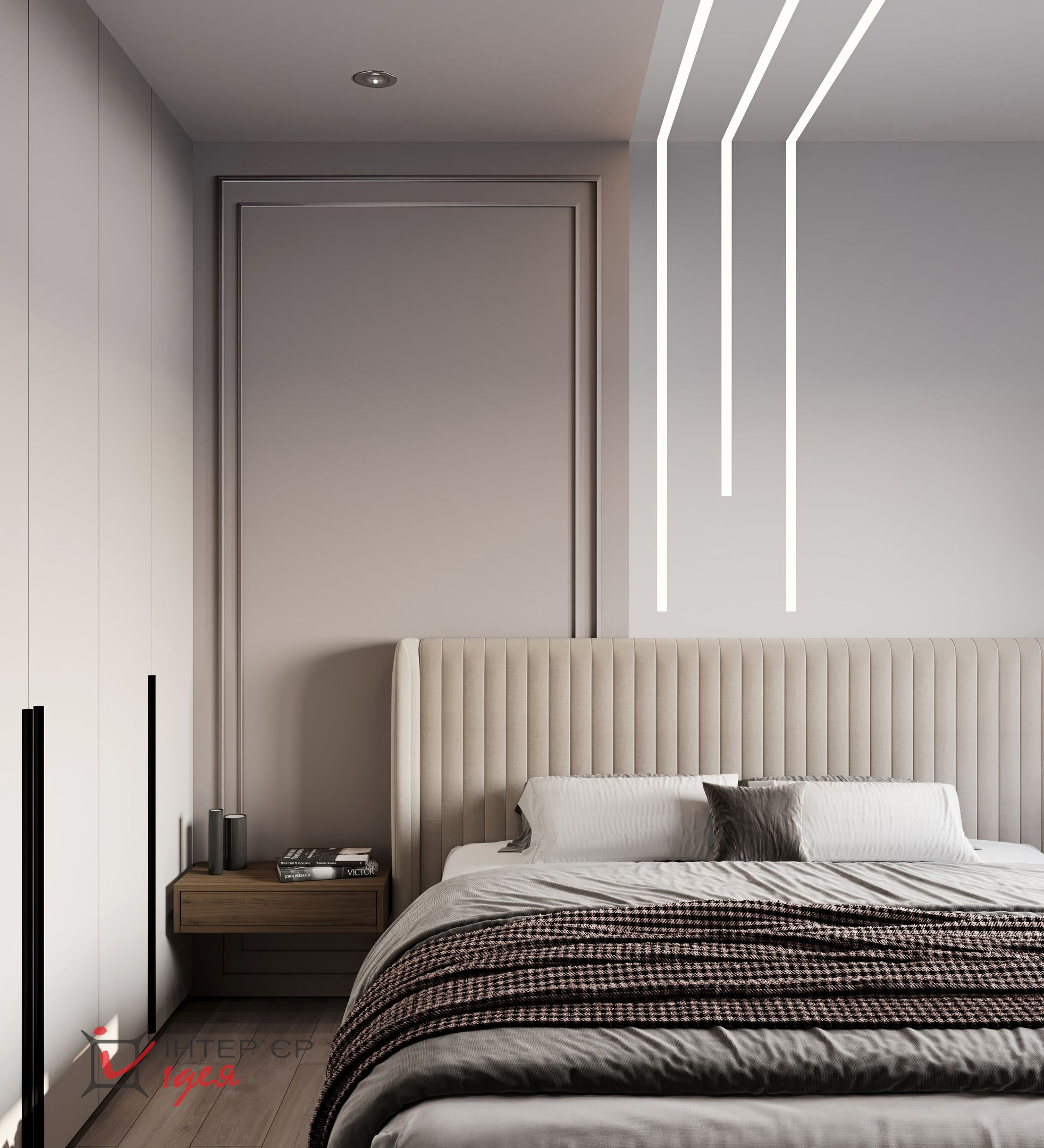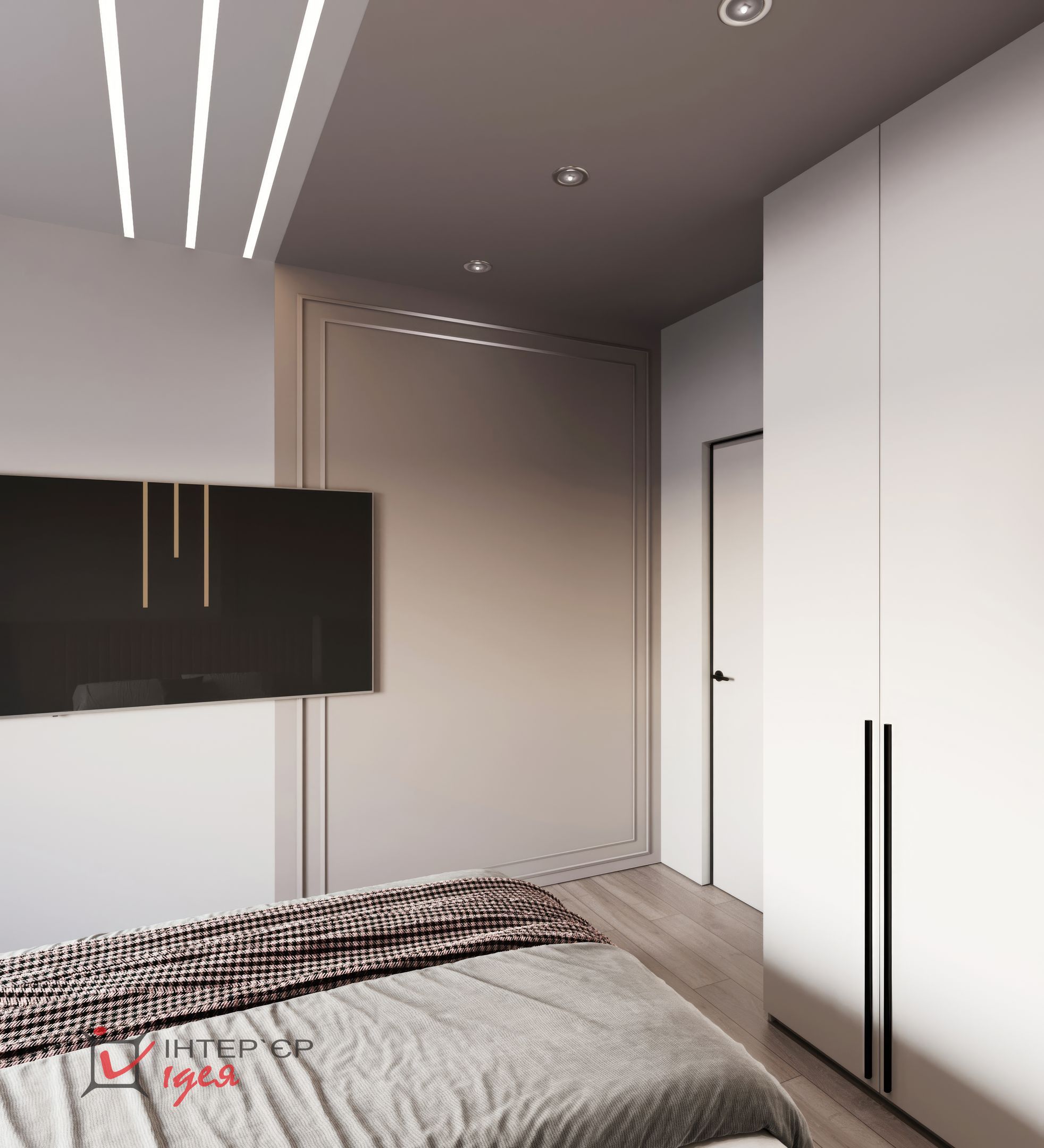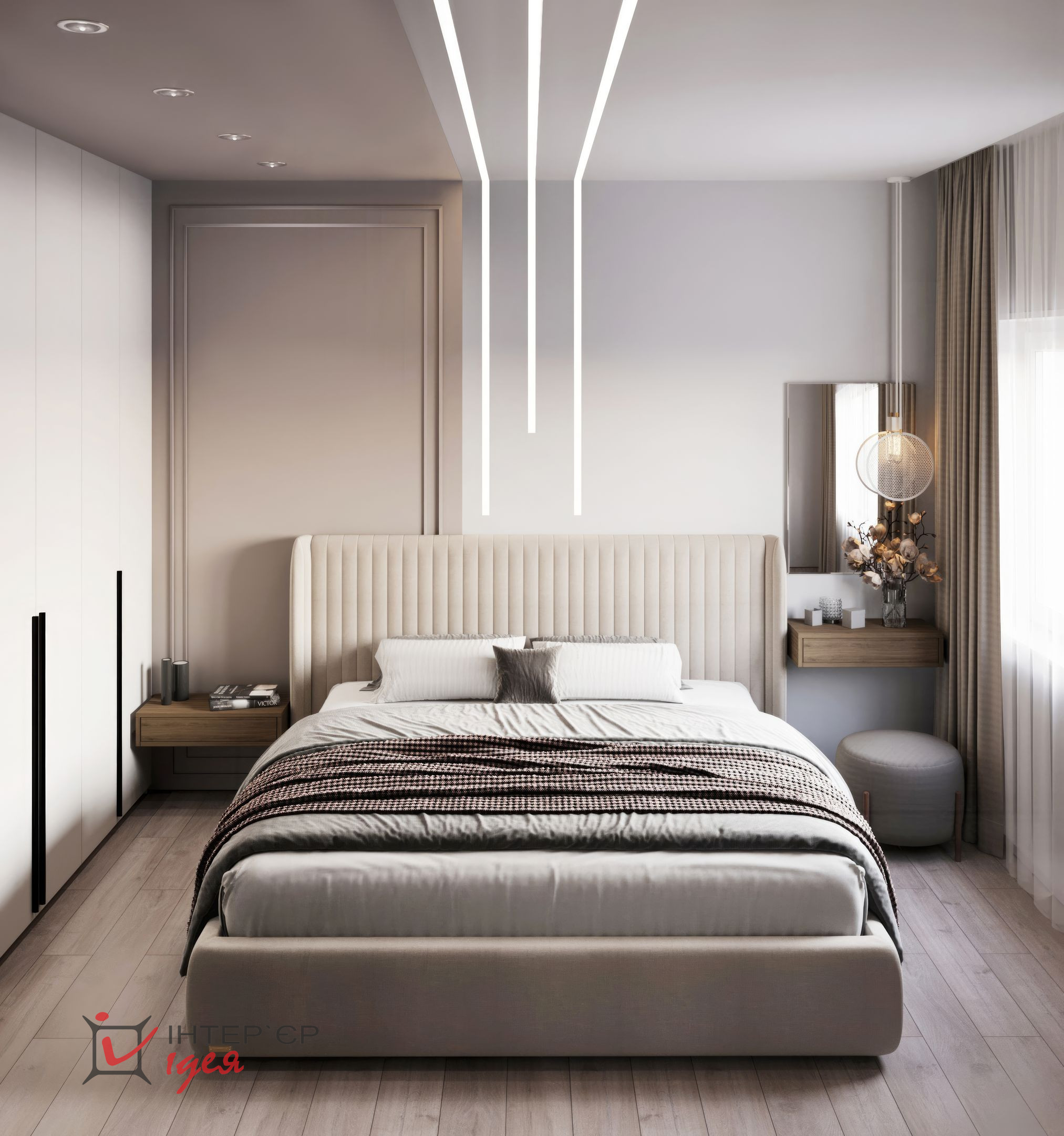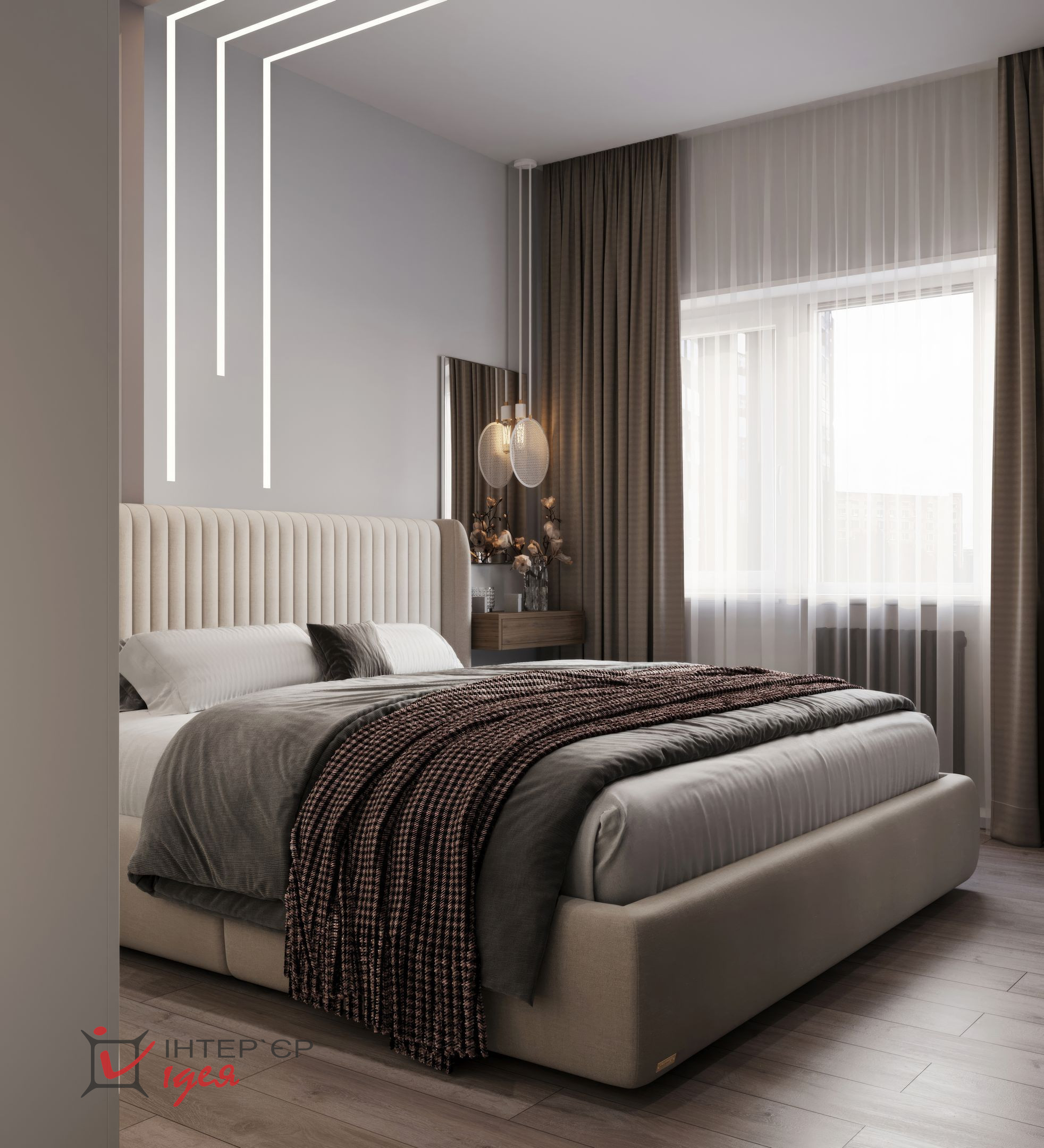 3. Освітлення: Важливо забезпечити приємне та функціональне освітлення у спальні. Використані стельові світильники та лед стрічки з плавним світлом для створення затишної атмосфери.