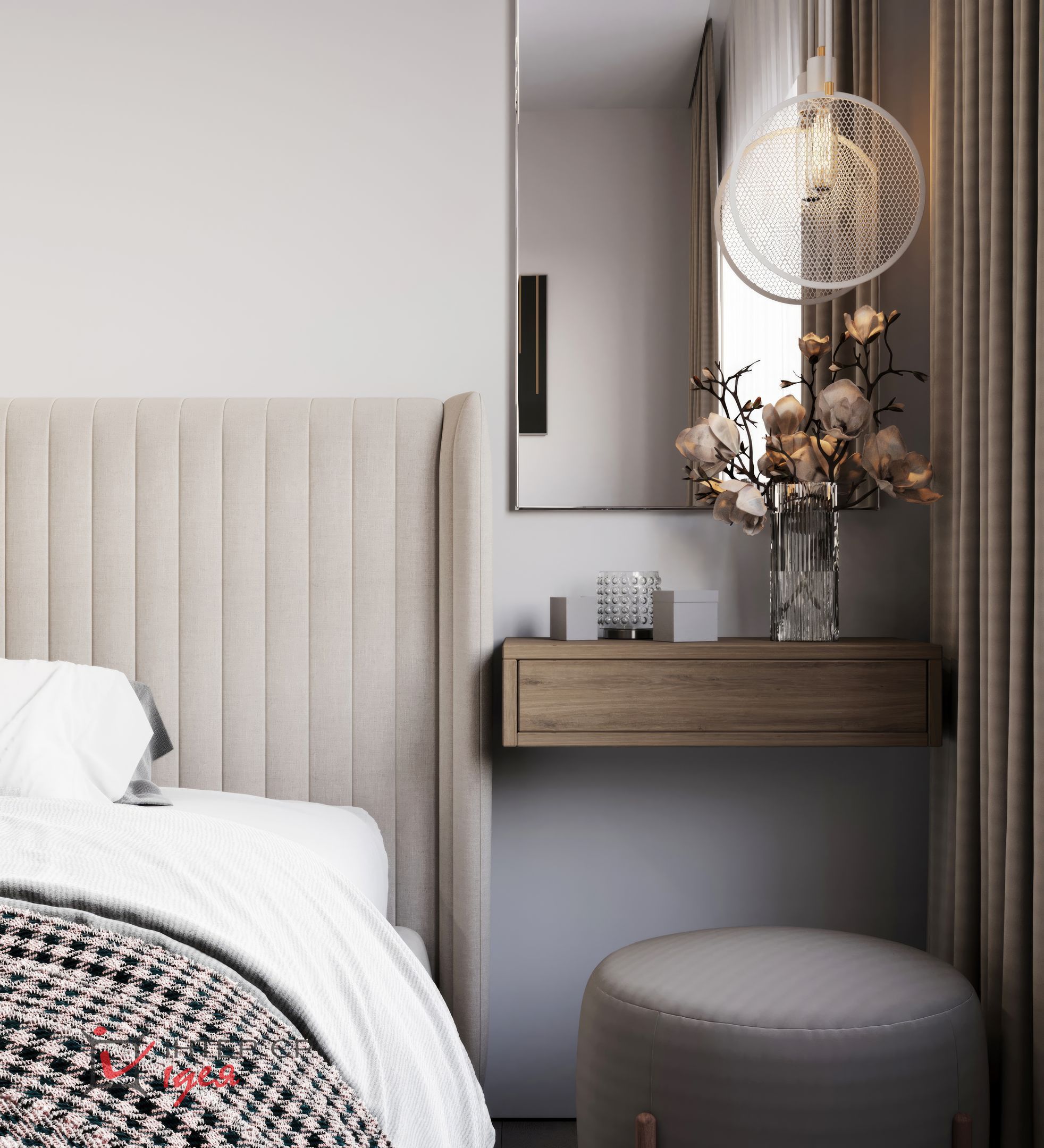 4. Акцентні деталі: Додані декоративні елементи, такі як вази, щоб підкреслити сучасний стиль спальні. Важливо не переборщити з декором, щоб зберегти мінімалістичний характер приміщення.