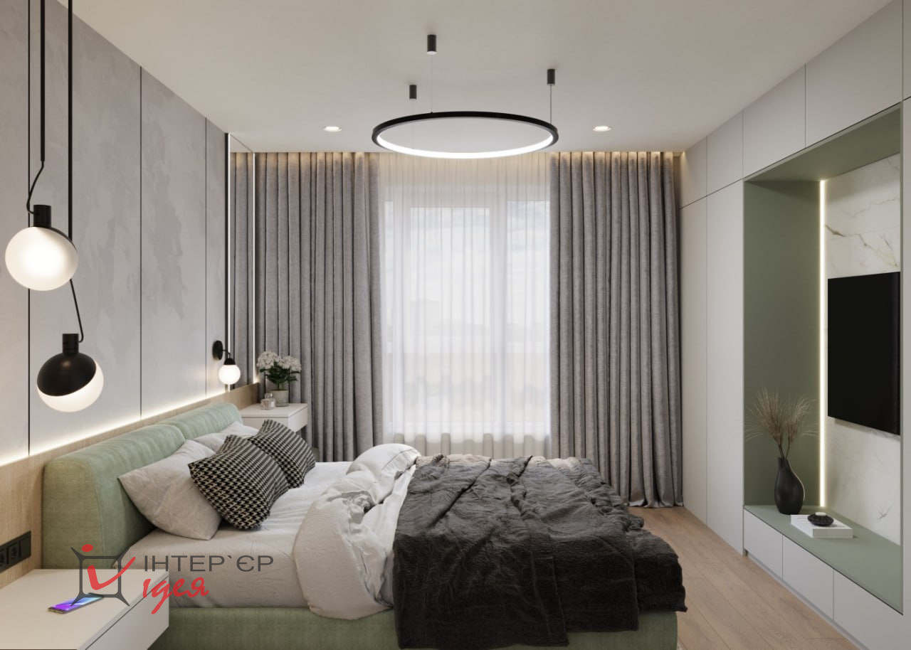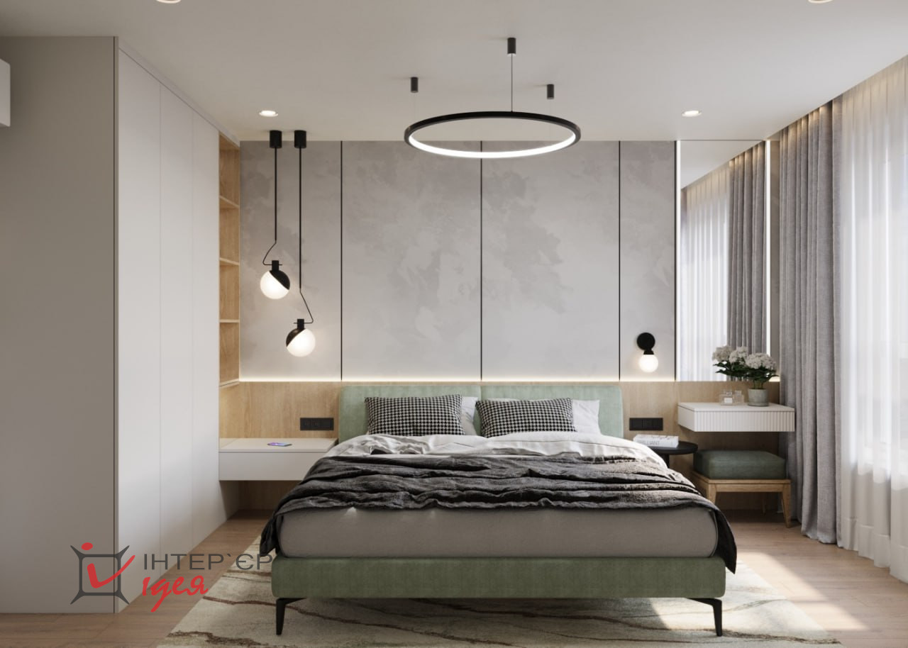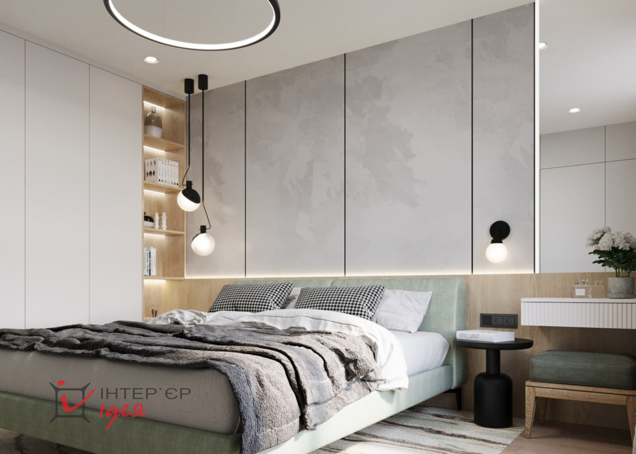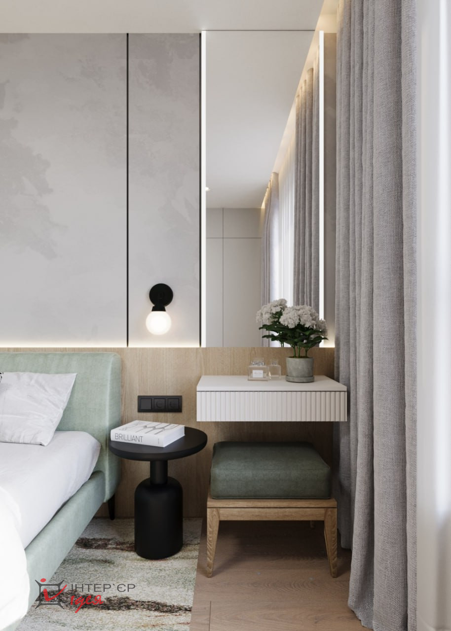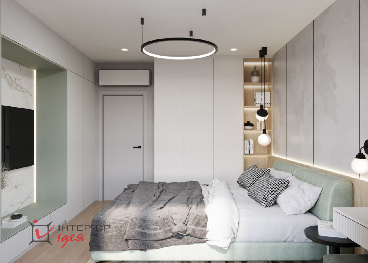 Інтер’єр виконаний в світлій палітрі з акцентом на фактури - натуральне дерево в меблях, мікроцемент на стіні за узголів'ям та мармур в ніші з телевізором.