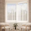 Підвісна консоль виконує роль туалетного столика або декоративної полиці, внизу розташований стильний пуф. Світильники мають плавні округлі форми, які гармонійно вписуються в загальну концепцію. Біля зручного двоспального ліжка з м'яким узголів'ям та підйомним механізмом розташовані дві підвісні тумби. Велике вікно із легкими шторами забезпечує багато природного світла, роблячи спальню затишною та просторою.