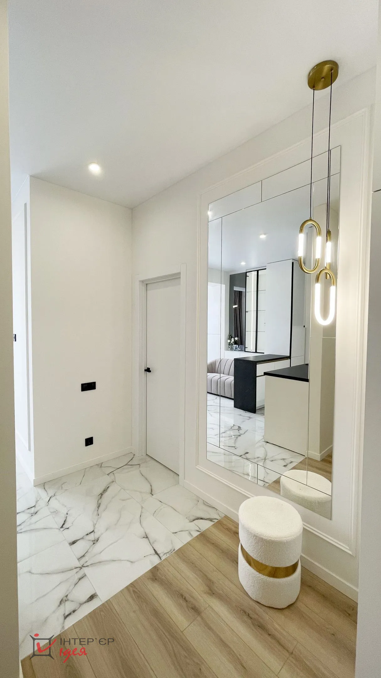 Простір продумано до дрібниць — від функціонального планування до гармонійної палітри відтінків. У квартирі розташовані кухня-вітальня, окрема спальня та санвузол. Завдяки грамотному переплануванню вдалося збільшити простір кухні-вітальні та створити окрему зону входу з місткою шафою і великим дзеркалом.